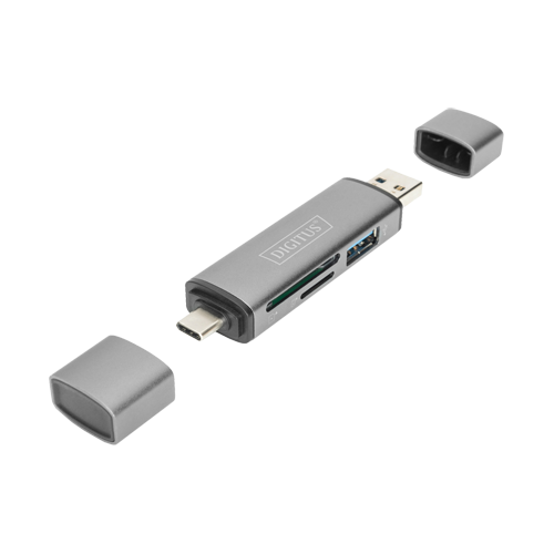 Der Dual-Kartenleser von DIGITUS® mit integriertem USB-Hub (OTG) kann wahlweise am Smartphone, Tablet oder Notebook angeschlossen werden. So können Sie auf eingesteckte Speichermedien wie z. B. USB-Sticks, SD- oder MircoSD-Speicherkarten zugreifen. Sie können das Gerät entweder über den USB-A (USB 3.0) oder über den USB-C™-Stecker des Hubs anschließen. Der USB-Hub kann zeitgleich mit dem Speicherkartenleser genutzt werden, so können auch Dateien zwischen beiden Anschlüssen verschoben oder kopiert werden. Die Installation von Treibern oder Apps ist dank Plug and Play nicht notwendig. Ideal beispielsweise zur Sicherung von Urlaubsfotos direkt vor Ort, ohne ein Notebook nutzen zu müssen.