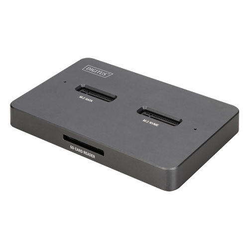 Die 3-in-1 Docking Station von DIGITUS® kann M.2 SSDs in NVMe- oder SATA-Technologie aufnehmen, zusätzlich befindet sich ein SD-Express 7.1 Kartenlesegerät mit höchsten Datentransferraten an Board. Verwalten Sie M.2 Datenträger mit bis zu 4 TB je Einschub und zusätzlich SD-Karten bis 2 TB.