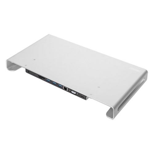 Die multifunktionale Docking Station von DIGITUS bietet Ihnen alles, um einen voll ausgestatteten und gleichzeitig ergonomischen Arbeitsplatz zu schaffen. Integriert in die formschöne Aluminium-Monitorerhöhung, erweitert die Docking Station Ihren USB Type-C-Port um 11 weitere Schnittstellen. Sie bietet eine HDMI- und eine VGA-Schnittstelle, an denen zwei Monitore zeitgleich betrieben werden können oder auch Beamer und TV-Geräte angeschlossen werden können (SST Mode). Zusammen mit Ihrem vorhandenen Bildschirm können Sie somit Ihren Desktop gespiegelt oder erweitert auf bis zu 3 Displays darstellen. Ausgestattet ist die Docking Station außerdem mit zwei USB-C Anschlüssen, einer davon mit Power Delivery Funktionalität (PD), wodurch Sie während des Betriebs zeitgleich Ihr angeschlossenes Notebook laden können und über den zweiten Port weitere Geräte mit USB-C-Schnittstelle anbinden können. Moderne Smartphones, Tablets oder ein weiteres Notebook mit USB-C-Port finden hier beispielsweise Anschluss.